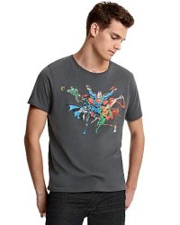 Short sleeve crewneck graphic tee with friends from DC Comic's popular Justice League team printed on front.