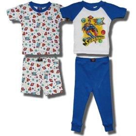 Made of 100% soft cotton, each Superman set includes 2 short-sleeve tops, 1 short bottom and 1 long bottom. All of the pieces can be worn interchangeably. Manufacturer recommends wearing these garments snug fitting to reduce the risk of fire as the fabric is not flame resistant. They are machine washable. Imported.