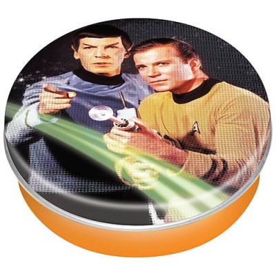 Kirk and Spock together for eternity. Well, for at least as long as this durable, desirable Star Trek Circle Mini Tin Case lasts. Featuring an unforgettable picture of the daunting duo from decks of the Enterprise, it's an exciting collector's piece that you'll treasure for a long, long time! Measures 2-inches in diameter x 3/4-inch deep.