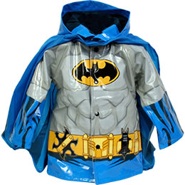 A little rain won't stop the Caped Crusader from saving Gotham City! This Batman cape raincoat will keep you protected as you hang the bad guys out to dry. This waterproof blue, black, and gray coat resembles Batman's suit and features a detachable blue cape with the Batman symbol. Outer shell is 100% polyurethane; lining is 65% polyester, 35% cotton. Available in kids' sizes.