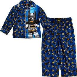 Keep your little Batman fan cozy and warm with this Lego coat pajama set. This blue Batman-themed pajama set features a long sleeve, button down top and pants with an elastic waist. 100% soft, flame resistant polyester. Available in kids sizes.