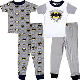 Mix and match between the two tops and two bottoms included in this Batman all-over print sleepwear set for toddlers. The first top and bottom features a repeated pattern of the classic oval Bat logo with a tribal design. The second top and bottom features a large Bat logo on the white and grey top and grey full length pants. Both pants feature the back logo on the elastic waistband and have black cuffs. For child's safety, garment should fit snugly. This garment is not flame resistant. 100% cotton, tumble dry low. Available in toddlers' sizes.