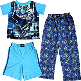 This boys Batman: The Dark Knight sleepwear set featuring The Joker will have your little one giggling as he drifts off to sleep. This 3-piece pajama set consists of a short sleeve top, full length pants, and shorts, all featuring images of the Joker and the Dark Knight. The soft, lightweight material is 100% polyester and flame resistant. Machine washable, tumble dry on low. Available in boys' sizes.