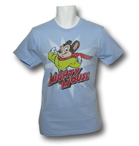 Made from 100% Cotton, this light blue t-shirt features a classic, almost mid-sketch illustration of Mighty Mouse posing for the camera! Your camera, stooooopid! This Mighty Mouse tee is also slightly distressed, adding to the already prevalent, vintage look. Could Mighty Mouse take Superman? Put it this way: How many times do you think Superman's knees could take a punch that deflects tornados?