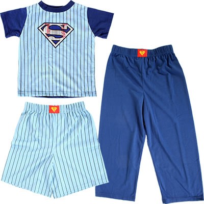 This Superman 3-piece baseball sleepwear set for boys is sure to hit a home run with your little super slugger. Set includes a striped, light blue top with stripes and the Superman shield logo front and center, dark blue long pants, and light blue striped shorts. Both the long pants and shorts feature a red and yellow Superman logo on the elastic waistband. The soft, lightweight material is 100% polyester and flame resistant. Machine washable, tumble dry on low. Available in boys' sizes.