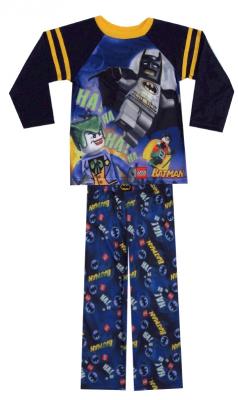 These flame resistant long sleeve pajamas for boys feature LEGO Figures of Batman, Robin and The Joker and read 'HA! HA' on a blue background