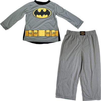Bedtime will be an adventure in this boys' Batman long-sleeved cape pajama set! The long-sleeved top has the Bat logo and utility belt printed on it while the matching gray long pants have the Bat logo on the elastic waistband. The removable black cape is affixed with Velcro and has the classic yellow and black Bat logo centered on the back. These soft, lightweight pajamas are 100% polyester and are flame resistant. Available in boys' sizes 4-7