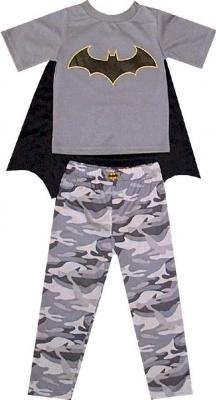 These flame retardant pajamas for children feature Batman's Bat Logo on the front on a solid gray short sleeve top and gray camo long leg bottoms