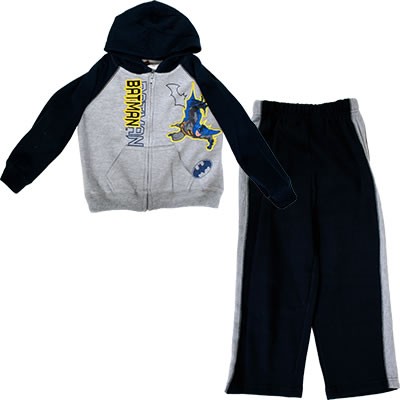 Keep the superhero in your life warm with this comfy Batman fleece hoodie and pants set. This black and gray fleece hoodie and pants set features embroidered Batman logos on the front. 80% cotton, 20% polyester. Machine washable. Available in kids sizes.