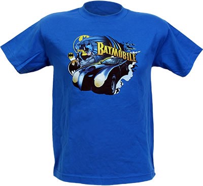 Satisfy your need for speed with this Batman Batmobile t-shirt. This 100% cotton bright blue t-shirt features a comic style image of Batman with his super enhanced vehicle mid-chase. Available in youth sizes.