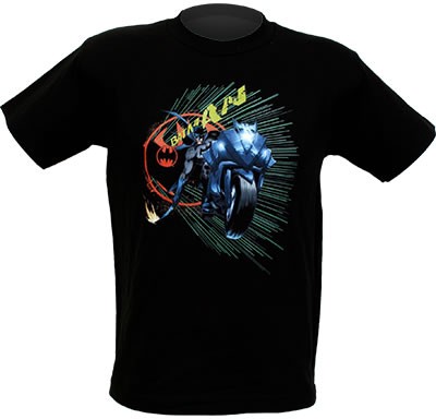 The Caped Crusader becomes a mean lean riding machine on this Batcycle t-shirt. This 100% cotton black t-shirt features the Dark Knight speeding on his super enhanced motorcycle, ready to take on villains as they come. Available in youth sizes.