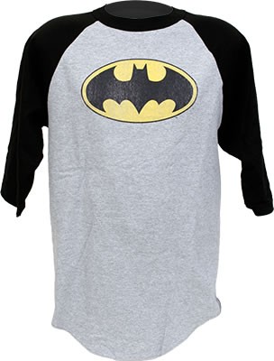 Don this Batman logo baseball t-shirt and get ready to strike fear in the hearts of foul criminals. Heh. This heather gray t-shirt features three quarter length black sleeves and a distressed, retro Batman symbol on the front. 90% cotton, 10% polyester. Available in adult sizes.