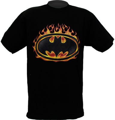 This Batman logo t-shirt is on fire! This 100% cotton black t-shirt features a blazing Batman logo with yellow and orange flames. Available in adult sizes