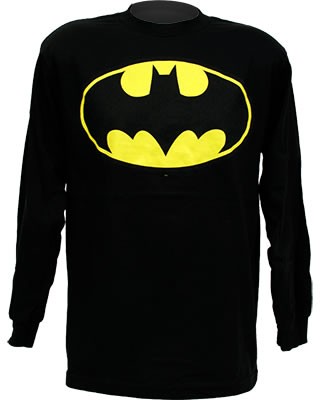 This Batman classic logo long-sleeved t-shirt is a must have as the cooler weather approaches this season. This comfy 100% cotton black t-shirt features a bright, classic Batman symbol on the front and long sleeves. Great for layering! Available in adult sizes.