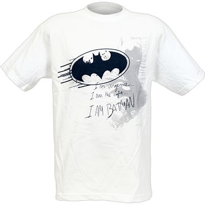 Who is the Batman? This I Am Vengeance t-shirt says it all. This 100% cotton white t-shirt features a splattered black Bat symbol with a shadowy silhouette of Batman in the background, remnants of some computer data analysis, and the words I am vengeance. I am the night. I am Batman. Available in adult sizes.