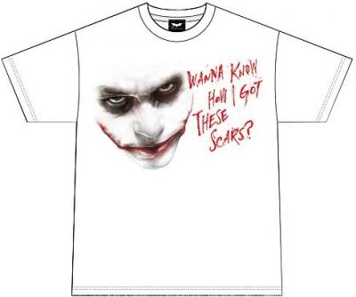 Batman: The Dark Knight Wanna Know T-Shirt. There are many stories as to how The Joker got his scars?but which one is the truth? Keep them guessing with this 100% cotton, high-quality, pre-shrunk white t-shirt. Machine washable. Order yours today!