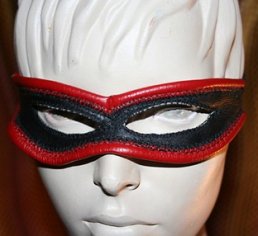 Black leather mask,edged with red vinyl. Self-lined/reversible with leather covered elastic head strap. Adjustable and suitable for men or women.
