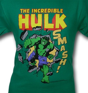 Made from 100% Cotton, we have a kelly green t-shirt featuring an image of the Hulk beating the hell out of an innocent wall! Damn it, Hulk, you've caused the Wall family enough trauma over your comic book career. Just give them some time to...rebuild, for pity's sake! Anyway, here's an image of Hulk having it out with another wall. Well, the wall did look at him oddly. Hulk's punch was righteous! This green t-shirt is for you, fan of the Hulk, but not for you, wall sympathizer!