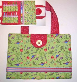 Case measures 6 1/2" high (13" when open) x 9" wide when closed. Case closes with velcro that is attached to the flap and case front. Decor bond interfacing is applied for durability, body, and stability. Handles are made from nylon webbing.It will hold a small activity book or fun pad and 12 crayons, which are both included (crayons & book may vary from picture).I can also custom make a case to hold jumbo crayons if you wish (8 crayons will be included).