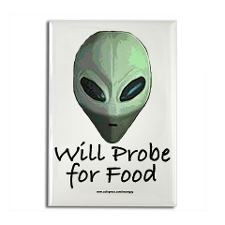 "Will Probe for Food" This homeless grey alien offers abduction... um... services for a meal. (UFO, alien abduction, geek humor, science fiction, sci-fi, anal probe, funny, weird, strange)