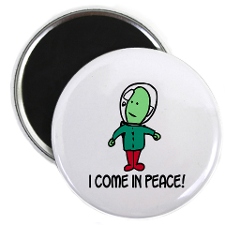 Our cool little green man is great for peaceniks and aliens of all types! So fun! Spaceman with I Come in Peace underneath.