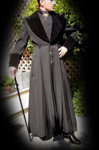It embraces such theatre and grace. Shoulders and waist are emphasized with 5 box pleats in the back and a diamond of velvet at the centre of the waist in the back. The Lestat is fully lined and wide Black velvet cuffs and lapels finish the piece.