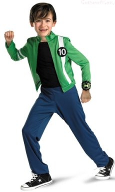 White shirt with black vertical stripe in center, khaki-look pants and Omnitrix device.