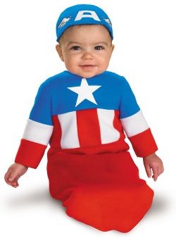 He’s been ready to defend his country since birth! This All-American superhero is ready to save the world, no matter how little he is! His costume includes a bunting with a blue top, white star, red and white striped details, and a red bottom. Also included is a blue soft cape with a printed “A” and wing detailing on the sides.