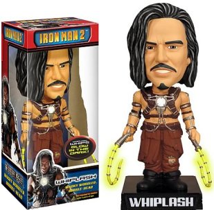 Iron Man 2 Bobblehead Whiplash is made of PVC and measures approximately 7" tall. Hand painted. Added Feature: Whiplash whips glow in the dark!