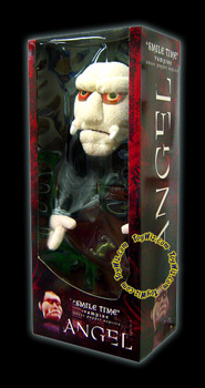 Now you can celebrate five wonderful seasons of Angel with your very own Angel puppet from the now-classic episode, "Smile Time!" Written by Ben Edlund of "Tick" fame and series Buffy-verse creator Joss Whedon, Angel is transformed into a little plush vampire with a soul! Measuring just over 21" high (exactly 1/2 scale of the prop puppet used in the episode), the puppet features a faux leather coat and boots, and a mouth that really opens and closes! Packaged in a deluxe window box, this will only be available for a short time, so grab it now!