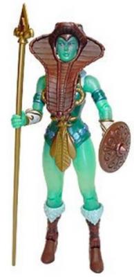 Masters of the Universe: Classics: The Goddess utilizes the Teela mold with alternate head and Snake Armor trappings; emerald-skinned with darker-green attire, The Goddess is equipped with the Staff of Elders and buckler, and is accompanied by duplicate versions of the Corodite Armor, Hero Shield and Power Axe bestowed to He-Man. In the original mini-comic, The Goddess was in process of defending herself against a bear-like saber-toothed creature when He-Man, a barbarian warrior, overpowered the creature and rescued The Goddess. Impressed with He-Man’s strength and courage, The Goddess led He-Man to a cave where she presented him with power-imbuing equipment. The MOTU Classics version is named Sharella, and is classified as He-Man’s Trainer; Sharella is charged with the task of keeping separate the twin halves of the Sword of He and of the training of guardians, many bearing the title of ‘He-Man’, in that capacity.