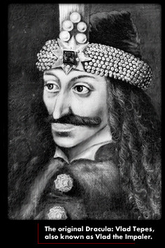 Vlad Dracula was a real Romanian prince who lived in the 15th century who was noted for his military campaigns against the Turks. In Romania he is considered a hero, even today. (For instance, the Romanian military has honored him by naming a modern assault helicopter the AH1 RO-Dracula.) Vlad was also a mass murderer and a fiend whose favorite form of killing was impalement. This was a type of crucifixion except instead of hanging the victim on a cross, the victim was impaled, from bottom up, with a long, sharp, wooden pole -- in other words, a stake was driven into the body vertically. The body was then displayed for Vlad Dracula, who once enjoyed dining amidst a forest of impaled bodies. Allegedly Vlad once killed 20,000 Turks in this way and lined them up as scarecrows to terrify any further enemies. (Vlad did not limit his murderous means to impalement, however; he also enjoyed cooking his victims and chopping them up.)