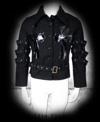 Belts and buckles around the sleeves and waist. Pleather crosses on the chest and a classic vampire cape collar.