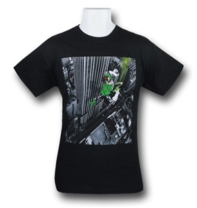 Green Lantern races to the rescue on this Green Lantern Photoreal Urban Flight T-Shirt. The photographic cityscape background in gray scale sets off the full color comic art for an eye catching effect on this 100% cotton black tshirt. What Hal Jordan is racing to rescue is up to you, really. I have this image of him grabbing a terrible in flight movie and replacing it with some green energy shadow puppetry, thus saving the travelers of Coast City from a horrible fate. Way to go, GL!