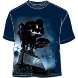 This is an officially licensed superhero tee shirt from Marvel Comics and features Venom sitting on a tombstone that says
