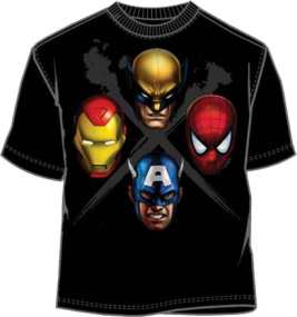 This t-shirt is in Hero Team-Up section under the category of Superhero T-Shirts and licensed merchandise from Marvel Comics. This tee shirt features Spiderman, Ironman, X-Man, Captain America. Our Four Pack Marvel Heroes T-Shirt makes a great gift for anyone who loves Marvel Comics. This tee shirt is made of preshrunk cotton and comes in adult sizes only. Our tees featuring Marvel Comics are extremely comfortable and these t-shirts not only look and feel great, but are made to last.