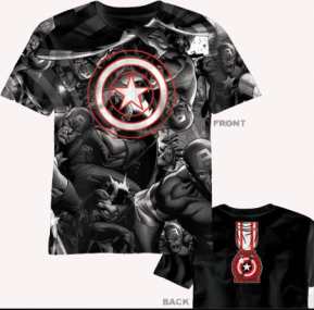 This t-shirt is in Hero Team-Up section under the category of Superhero T-Shirts and licensed merchandise from Marvel Comics. This tee shirt features his logo on the front and his medal of honor on the back . Our Captain Rogers AOP Captain America T-Shirt makes a great gift for anyone who loves Marvel Comics. This tee shirt is made of preshrunk cotton and comes in adult sizes only. Our tees featuring Marvel Comics are extremely comfortable and these t-shirts not only look and feel great, but are made to last.