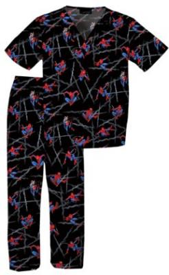 Marvel Heroes Scrub Kids Sizes: Web Head Style. V neck kids dolman sleeve top with chest pocket and matching elastic waist pant with back patch pocket. A Tooniforms Scrub Kids Set by Cherokee Medical.