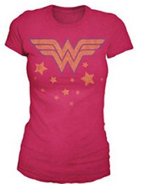 Wonder Woman and Stars adorn this vintage-style distressed-print juniors tee. What's cool is the logo is darker on the inside as shown in the product image. Color: Red
