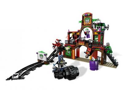 The Riddler™, The Joker and his sidekick Harley Quinn are holding Robin hostage at their evil funhouse! As our hero Batman™ jumps off his cool Batcycle, can he avoid the trap door, big hammer and moving floor and rescue his crime-fighting partner? Includes 5 minifigures: Batman™, Robin, The Joker ™, The Riddler ™ and Harley Quinn.