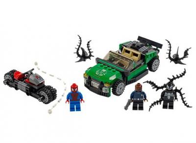 Venom™ has taken control of Nick Fury's S.H.I.E.L.D. flying car and is making a super-fast getaway. Send Spider-Man™ to the rescue in his cool Spider-Cycle! Help Spider-Man™ catch this venomous villain and return the car to the good guys! Watch out for Venom's vicious symbiont web attack! Use the folding wheels on both vehicles for the perfect high-speed pursuit in the air or on land. Includes 3 minifigures: Spider-Man™, Venom™, and Nick Fury™ with weapon.