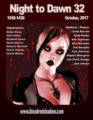 Monsters under the bed exist. If you didn’t think so before, you will after reading Night to Dawn 32, in particular, Kempka’s “Night Sounds.” Balloons have crept into the stories via my flash piece, “Unseen Hands.” As for clowns, whom we associate with balloons, you’ll find plenty in Manzolillo’s “Lip of the Stars.” These clowns may appear friendly but aren’t…quite. Find out what happens when a soldier goes astray in Kolacki’s “Log of Zombies Dispatched.” Illustrations by Marge Simon, Sandy DeLuca, Elizabeth Pierce, Chris Friend, Teresa Tunaley, Denny E. Marshall, and Ron Weems.