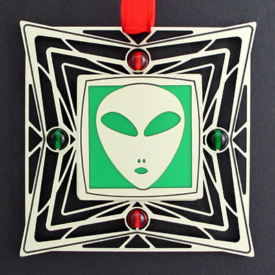 Stylish, contemporary beaded Christmas ornament in fun etched metal design of alien in center. Custom select silver or gold tone, shimmery ribbon, glass beads and iridescent color for unique personalized holiday ornament.