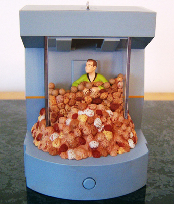 "The Trouble With Tribbles" ornament is the newest in the line of scene based Star Trek ornaments. s usual for these kinds of ornaments, there are sounds and voice effects when a button is pressed. As a bonus, this nice ornament also includes the constant barrage of Tribbles on Captain Kirk as in the original episode.
