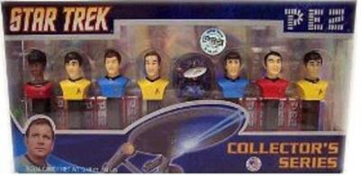 The voyages of the Starship Enterprise have finally led these famous characters to assemble in this limited edition PEZ Star Trek collector's set. Seven PEZ dispensers feature the famous faces of the original Star Trek team: Kirk, Spock, McCoy, Scotty, Chekov, Uhura and Sulu while an eighth PEZ dispenser features the U.S.S. Enterprise battling for intergalactic peace over earth. Set includes twelve packs (3.48 ounces) of PEZ candy and eight PEZ dispensers and makes the perfect gift for any serious Star Trek or PEZ fan. Set measures 6" H x 13 3/4" W x 2" D. Individual dispensers measure 4 3/4" H.