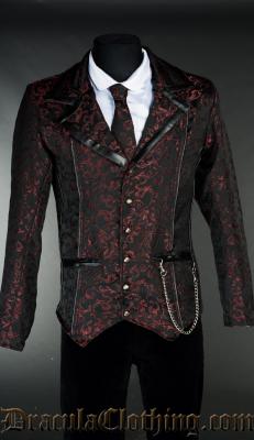 A black and red brocade jacket with faux leather details. Great as part of a unique suit or a vampire look.