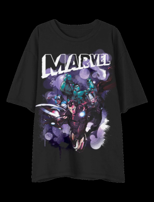 Avengers, assemble! No matter the villain or cataclysmic event, we can always count on Earth's mightiest heroes! This tee depicts an illustration of Captain America, Hulk, Thor and Iron Man ready to kick some super villain butt, with the Marvel logo printed above in block lettering.