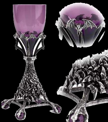A host of bats infest the rafters of the amethyst Wine Goblet; while bat claw feet clutch matching glass balls. Cast in high quality pewter.