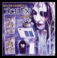 The most unique make-up kit in years. Frozen look!! Each kit contains 3 color ice make-up tray, ice powder, ice crystals, ice gel with adhesive, latex sponge and brush. Complete with chrome fangs and custom fit putty in a coffin.