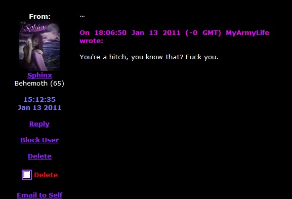 I was raised not to start shit on the inside. You do know that everyone was safe, right? You just used it as an excuse to blame me for something else that you were too lazy to do. I can't argue. That's the only thing that irks me. I can't defend myself with false statements that make no sense. Yeah, I got to you, admit it. That's where I stand. >:)